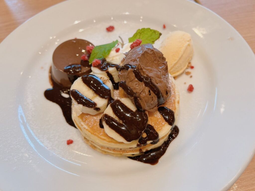 アイスやチョコレートプリンなどものっている、とても豪華なパンケーキプレートでした✨