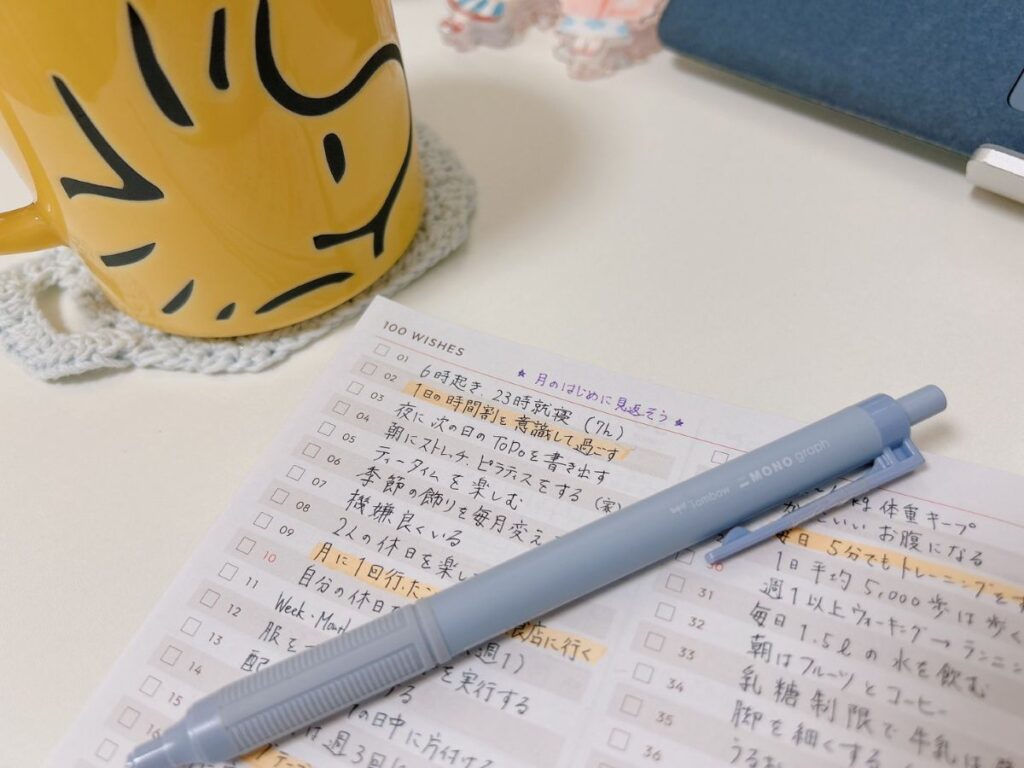 私はすぐに見返せるように毎日使う手帳に100リストを書いていますが、