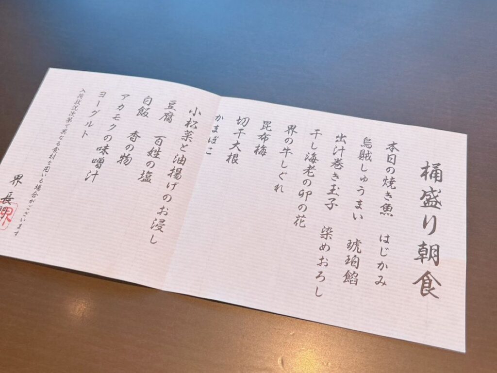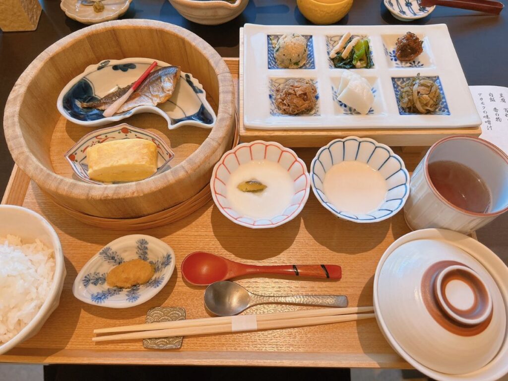 メニューに「桶盛朝食」と書かれており、どういったものなのだろうと思っていたら、本当に桶に入って運ばれてきたので驚きでした!
