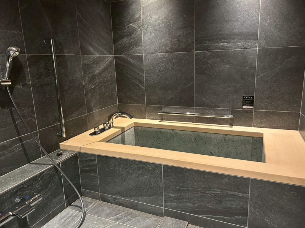 こちらがそのこだわりのお風呂。青森ヒバが香る湯船は十和田石が使用されているそうです。