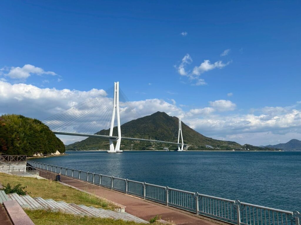 この日は朝から曇りで天気がいまいちだったのですが、大三島に来てからは青空が広がり多々羅大橋と背景の山が映えてとても良い眺めでした✨